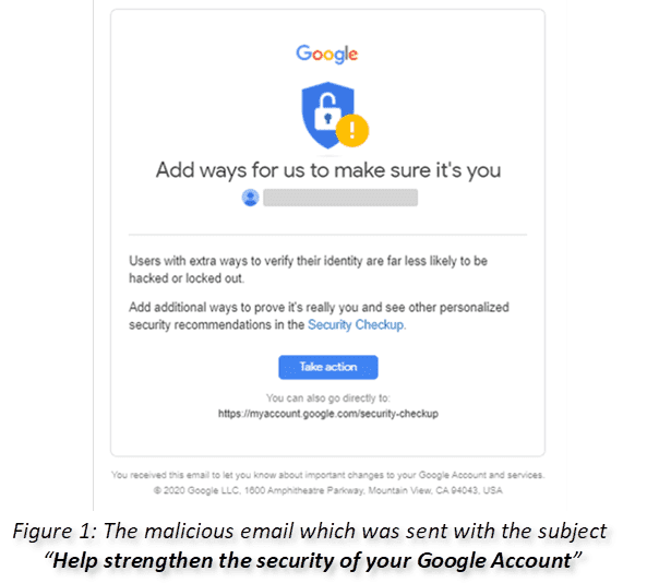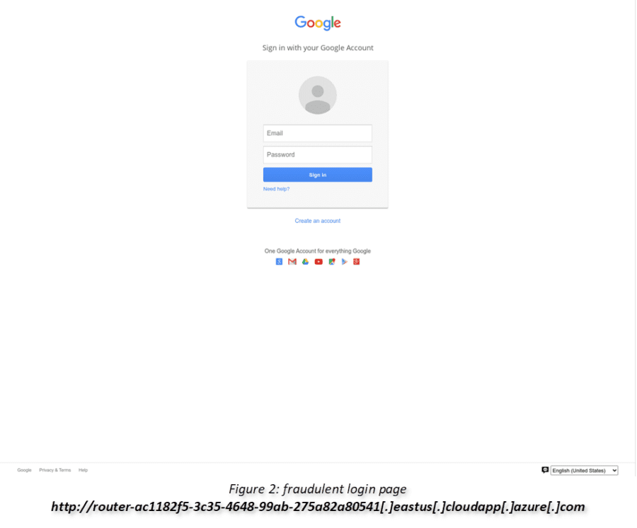 During this quarter, we witnessed a malicious phishing mail that was trying to steal access credentials to a Google account. The email (see Figure 1), which was sent from the email address Google (no-reply@accounts[.]google[.]com), contained the subject “Help strengthen the security of your Google Account”. In the following fraudulent email we notice the year wasn’t changed (“2020 Google”). The attacker was trying to lure the victim to click on a malicious link (http://router-ac1182f5-3c35-4648-99ab-275a82a80541[.]eastus[.]cloudapp[.]azure[.]com) which redirects the user to a fraudulent malicious login page that looks like the real Google login website (see Figure 2). In the malicious link, the user needed to enter their Google account details.