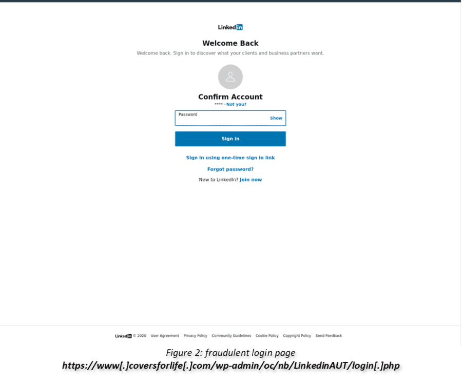 In this phishing email, we see an attempt to steal a user’s LinkedIn account information. The email (see Figure 1) which was sent from the email address Linkedln (linkedin@connect[.]com), contained the subject “You have a new Linkedln business invitation from *****”. The attacker was trying to lure the victim to click on a malicious link, which redirects the user to a fraudulent LinkedIn login page (see Figure 2). In the malicious link (https://www[.]coversforlife[.]com/wp-admin/oc/nb/LinkedinAUT/login[.]php), the user needed to enter their username and their password. On the fraudulent website we can see that the year wasn’t changed (“2020 LinkedIn”)