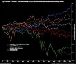 Of the last five tournament winners, Greece and Spain’s bourses outperformed the pan-European STOXX 600 after their 2004 and 2008 and 2012 wins, while only Portugal’s 2016 title was followed by notable underperformance.